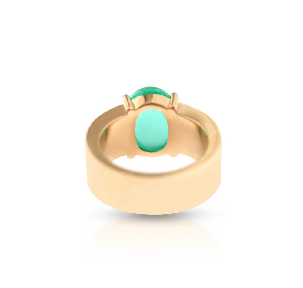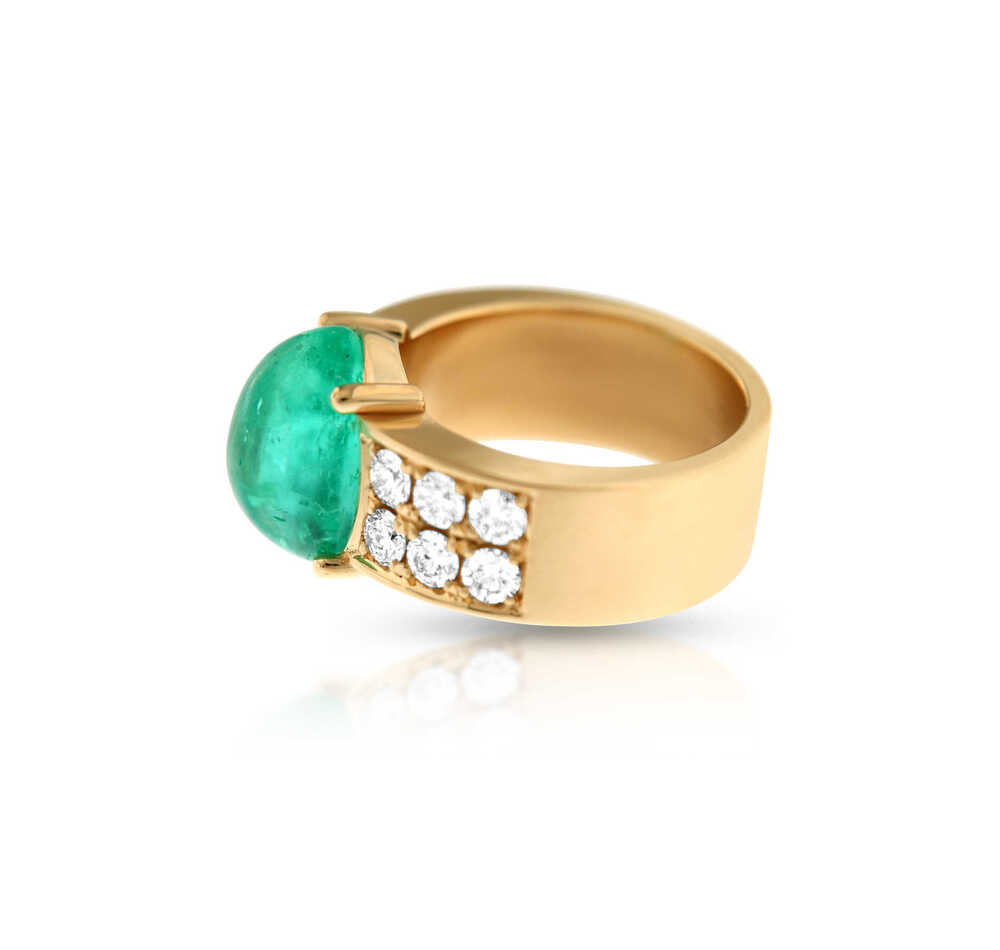 A beautiful oval emerald, cabochon cut. Light in color with few calcite inclusions. This ring is unique because of the clear yet intense color of the stone. A real candy.